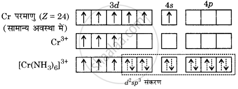 [Cr(NH3)6]3+ का निर्माण: [Cr(NH3)6]3+ आयन में क्रोमियम की ऑक्सीकरण अवस्था +3 है। क्रोमियम का इलेक्ट्रॉनिक विन्यास [Ar] 3d54s1 है। संकरण को निम्नलिखित आरेख में दर्शाया गया है –