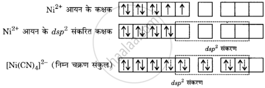 [Ni(CN)4]2− का निर्माण: [Ni(CN)4]2− में Ni की ऑक्सीकरण अवस्था +2 है तथा इसका इलेक्ट्रॉनिक विन्यास 3d है। संकरण को निम्नवत् समझाया जा सकता है –