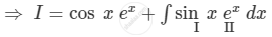 \[ \Rightarrow I = \cos x e^x + \sin x\int e^x dx - \int\left[ \frac{d}{dx}\left( \sin x \right)\int e^x dx \right]dx\]