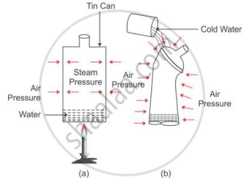 Take a thin can fitted with an airtight stopper. The stopper is removed and a small quantity of water is boiled in the can. Gradually the steam occupies the entire space of can by expelling the air from it [Fig (a)]. Then stopper is then tightly replaced and simultaneously the flame beneath the can is removed. Cold water is then poured over the can.