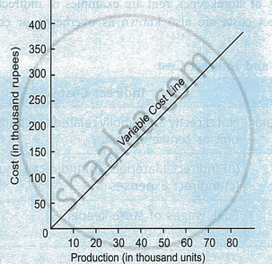 This graph shows that cost remains fixed at ₹ 1,50,000 from 0 to 1,00,000 units of output. It must be noted that fixed cost remains constant in total but fixed cost per unit of production changes with changes in the level of output. For example, when production is 30,000 units, fixed cost per unit is ₹ 5 (1,50,000 ÷ 30,000) but when production is 60,000 units, fixed cost per unit decreases to ₹ 2.5 (1,50,000 ÷ 60,000). - Variable costs: Variable costs are those costs which vary in amount with changes in the level of output or activity. Such costs increase and decrease in the same proportion in which the level of output increases or decreases. Variable costs vary in total amount but remain constant per unit of production. For example, when the level of output increases from 5,000 units to 6,000 units, the amount of variable costs increase from ₹ 25,000 to ₹ 30,000. In this case, the variable cost per unit remains unchanged at ₹ 5 (25,000 ÷ 5,000 and 30,000 ÷ 6,000). Thus, there is a linear relationship between volume of production and total variable costs. The behaviour of variable costs is shown in the graph. Sugarcane used to produce sugar is an example of variable cost.