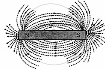 First method: Place cardboard on the top of a bar magnet and scatter some iron filings uniformly over the whole of cardboard. Now tap it with a pencil. The filing is magnetized by induction and arrange themselves in curved lines as shown in the figure. The curved lines are called the magnetic lines of force which may be defined as the lines in a magnetic field along which free magnetic poles tend to be driven if free to do so.