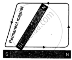 The specimen is then turned over and the other side is also magnetized in the same way. The end of the specimen where the south pole of the bar magnet leaves, becomes north pole. Similarly, the end of the specimen where the north pole of the bar magnet leaves, becomes the south pole. For strong magnetization, the two ends of the specimen are supported on the two poles of two other bar magnets, such that the pole of each magnet being the same as that of the stroking magnet over it. - Double Touch Method: This method is almost similar to the divided touch method. The only difference is that a piece of wood or cork is placed between the two opposite poles of the permanent magnets. The magnets are then moved together from the middle to the one end and then to the other end without lifting them from the specimen as shown in the figure. This process is repeated several times.
