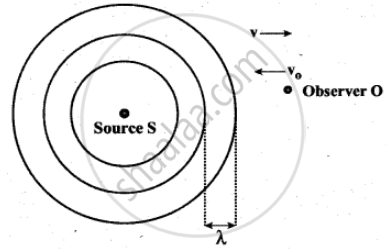 From the Figure, It is observed that both vo and v are in opposite direction. Then, their relative velocity is vr = v + vo. The wavelength of the sound wave is λ = `"v"/"f"`, which means the frequency observed by the observer O is f ‘ = `"v"_"r"/lambda`. Then