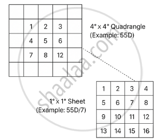 India’s topographical maps, prepared by the Survey of India, follow a grid-based nomenclature system based on the International Map of the World (IMW). The country is divided into 4° x 4° quadrangles (e.g., 55D), each subdivided into 16 smaller 1° x 1° degree sheets, numbered 1–16 in a standard grid pattern. These sheets are further split for larger-scale mapping, ensuring systematic coverage, uniformity, and easy referencing for various uses like planning, development, and defence.