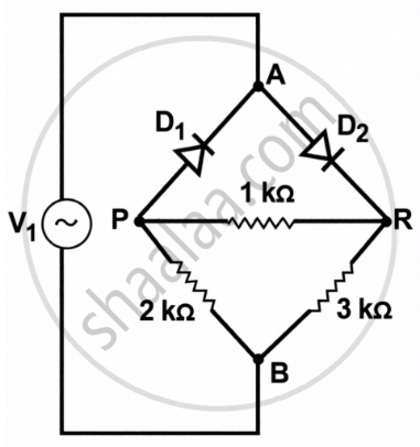 दो आदर्श डायोडों एवं तीन प्रतिरोधकों के नेटवर्क में सिरों A एवं B के बीच प्रत्यावर्ती (ac) वोल्टता Vi = 12 sin (100 πt) V चित्र में दर्शाए अनुसार लगाई गई है।
