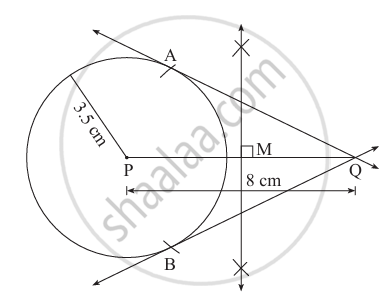 Draw a circle with centre P and radius 3.5 cm. Take point Q at a distance 8 cm from the centre. Construct tangents to the circle from point Q.