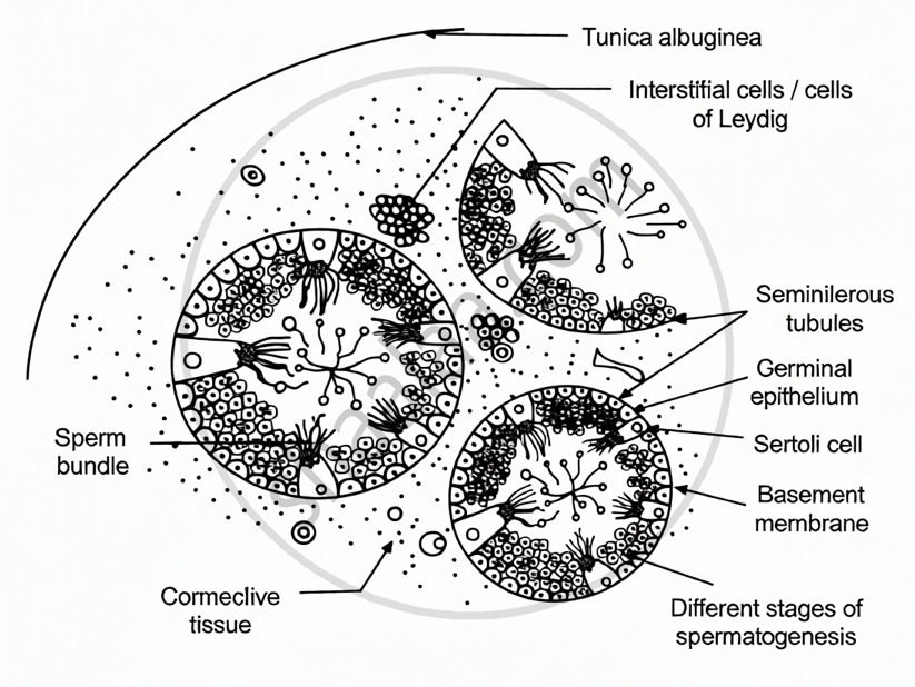 Draw a neat and well labelled diagram of T.S. of mammalian testis.