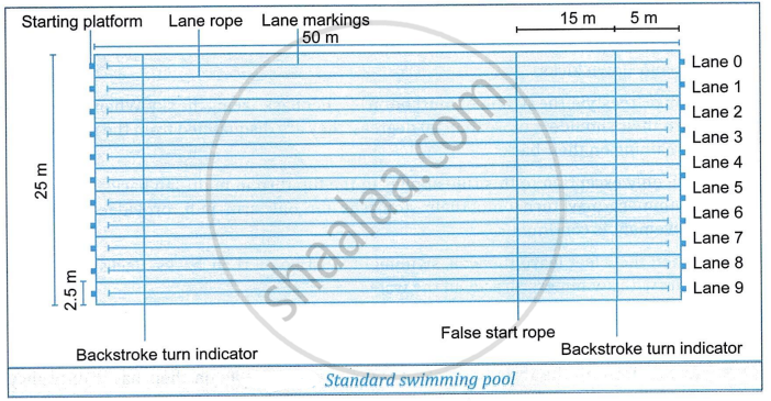 Draw a neat diagram of a standard swimming pool with all its dimensions and specifications.