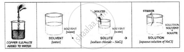 Draw a neat labelled diagram of the addition of copper sulphate to water. Label solute, solvent, and solution in the same.
