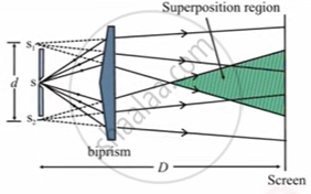 Draw a ray diagram showing position of virtual sources and region of interference in biprism experiment.