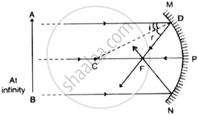 Draw a ray diagram to show the path of the reflected ray corresponding to an incident ray of light parallel to the principal axis of a concave mirror. Mark the angle of incidence and angle of reflection on it.