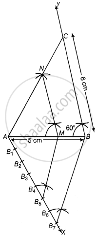 Draw a triangle ABC in which AB = 5 cm, BC = 6 cm and ∠ABC = 60°. Construct a triangle similar to ∆ABC with scale factor `5/7`. Justify the construction.