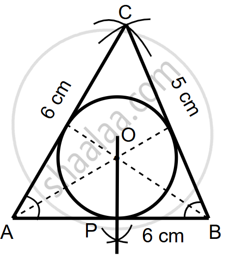 Draw a triangle whose sides are 6 cm, 5 cm and 6 cm and inscribe a circle in it. Find by measurement its radius.