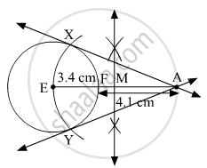 Draw a circle of radius 3.4 cm and centre E. Take a point F on the circle. Take another point A such that E-F-A and FA = 4.1 cm. Draw tangents to the circle from point A.