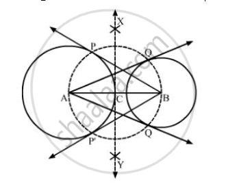 Here. AQ and AQ’ are the tangents from A to the circle with center B. Also, BP and BP’ are the tangents from B to the circle with center A.