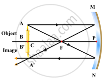 Draw the ray diagram and also state the position, the relative size and the nature of image formed by a concave mirror when the object is placed at the centre of curvature of the mirror.