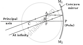 C: Centre of curvature, F: Focus, PF: Focal length (f), PC: Radius of curvature(R), AB: Object at infinity