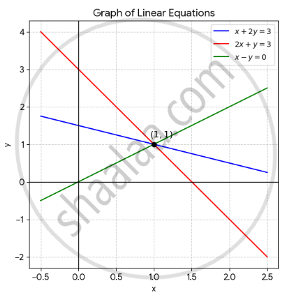 Draw the graph of the equations x + 2y = 3, 2x + y = 3 and x – y = 0. Show that these three lines pass through the same point. Find the co-ordinates of this common point.
