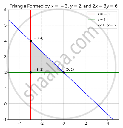 Draw the graphs of the equations x = –3, y = 2 and 2x + 3y = 6. Write down the vertices of the triangle formed by these lines.