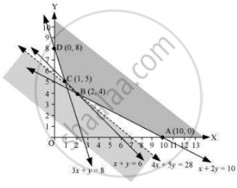 संभव क्षेत्र के कोने बिंदु ए(10, 0), बी(2, 4), सी(1, 5) और डी(0, 8) हैं |
