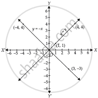 बिंदुओं (3, – 3) और (– 4, 4) को एक ग्राफ पेपर पर आलेखित करके उन्हें एक रेखा से जोड़ने पर हमें y = – x का ग्राफ प्राप्त होता है।