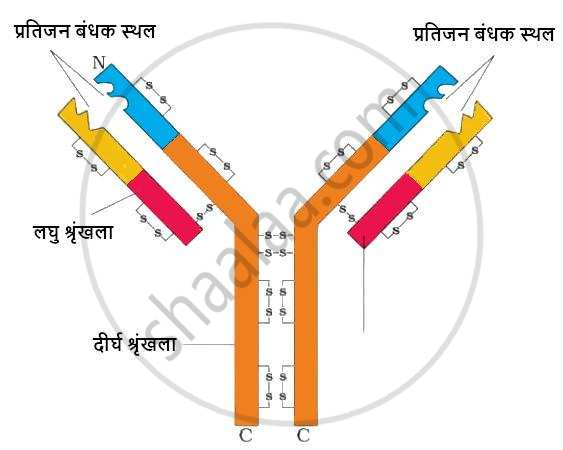 एक प्रतिरक्षी (ऐंटीबॉडी) अणु की संरचना का चित्र बनाकर उसके किन्हीं चार भागों को नामांकित कीजिए।