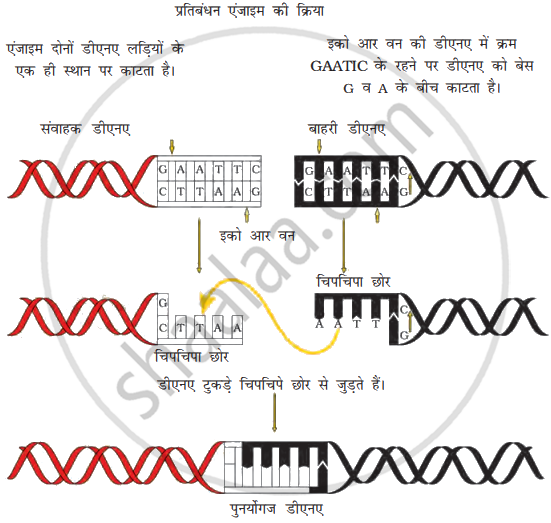 एक सचित्र (चार्ट) (आरेखित निरूपण के साथ) बनाइए जो प्रतिबंधन एंजाइम को (जिस क्रियाधार डीएनए पर यह कार्य करता है उसे), उन स्थलों को जहाँ यह डीएनए को काटता है व इनसे उत्पन्न उत्पाद को दर्शाता है।