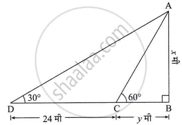एक व्यक्ति नदी के एक किनारे से दूसरे किनारे पर स्थित पेड़ की चोटी को देखता है, तो उस समय 60° माप का उन्नत कोण बनता है। यदि उसी रेखा में नदी के उसी किनारे से 24 मीटर की दूरी पर पीछे जाकर उसी पेड़ की चोटी को देखता है, तो 30° माप का उन्नत कोण बनता है। नदी की चौड़ाई और पेड़ की ऊँचाई ज्ञात करो। (√3 = 1.73)