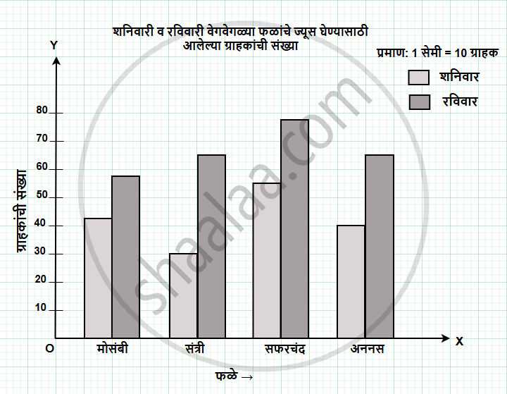 एका ज्यूस सेंटरवर शनिवारी व रविवारी वेगवेगळ्या फळांचे ज्यूस घेण्यासाठी आलेल्या ग्राहकांची संख्या सारणीत दर्शवली आहे. त्या माहितीवरून जोडस्तंभालेख काढा.