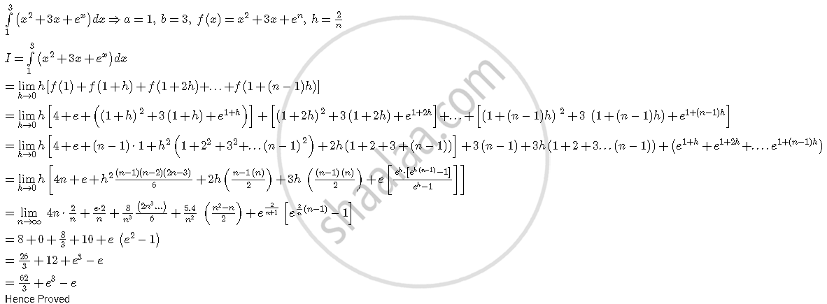 Evaluate : `int_1^3 (x^2 + 3x + e^x) dx` as the limit of the sum.