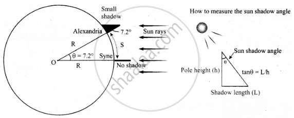 Eratosthenes observed that during noon time of summer solstice the Sun’s rays cast no shadow in the city Syne. It was located 500 miles away from Alexandria. On the same day and the same time, he found that in Alexandria the Sun’s rays made an angle of 7.2 degrees with local verticals as shown in the figure. He realized that this difference of 7.2 degrees was due to the curvature of the Earth.