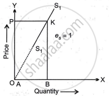 Supply curve S1S1, when extended, meets the X-axis at the point of origin so that AB = OB. Therefore, at point k on S1S1, the elasticity of supply `"AB"/"OB" = 1`.