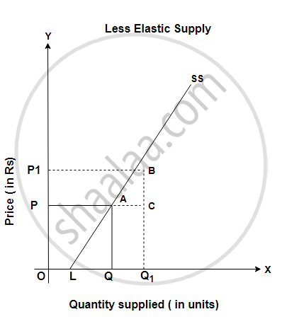 - Less Elastic Supply (Es < 1): If a supply curve meets the X-axis at some point, say, L in Fig., then supply is inelastic. As seen in the fig., Es = `(LQ)/(OQ)` and LQ < OQ. So, Es < 1, i.e., supply is less elastic.