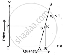 Point K indicates that at the OP price, the quantity supplied is OB. The elasticity of supply at point K on the supply curve SS is calculated by the formula `"AB"/"OB"`, i.e., the ratio of the horizontal segment AB divided by the quantity supplied OB.