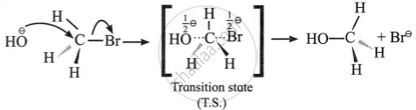- With the approach of \[\ce{(OH^\ominus)}\] group and the gradual departure of \[\ce{(Br^\ominus)}\], a stage comes where the central atom is attached to five substituents. This state is known as the transition state of the reaction.
