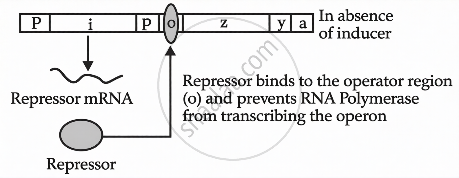 In the presence of lactose (inducer): Lactose binds to the repressor protein and inactivates it. As a result, the repressor cannot attach to the operator region. This allows RNA polymerase to bind to the promoter and start transcription. Consequently, the three structural genes are expressed, and their respective enzymes are produced. These enzymes then act on lactose and convert it into glucose and galactose.