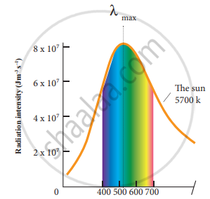 It is the wavelength at which the maximum intensity is 508 nm. Since the Sun’s temperature is around 5700 K, the spectrum of radiations emitted by the Sun lies between 400 nm to 700 nm which is the visible part, of the spectrum. It is shown in Figure.