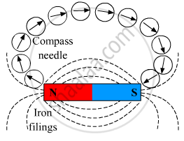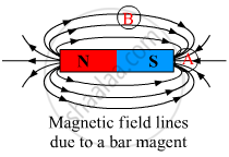 To find the direction of the magnetic field around a bar magnet, place a magnetic compass with its South-Pole near one of the poles of the bar magnet. Locate the point where the North-pole of the needle points. Now, lift the needle and place its South-Pole on the marked point. Now, again see where the North Pole points. Repeat this process and you will get the direction of the magnetic field as shown below.