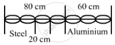 Figure shows an aluminium wire of length 60 cm joined to a steel wire of length 80 cm and stretched between two fixed supports. The tension produced is 40 N. The cross-sectional area of the steel wire is 1⋅0 mm2 and that of the aluminium wire is 3⋅0 mm2. What could be the minimum frequency of a tuning fork which can produce standing waves in the system with the joint as a node? The density of aluminium is 2⋅6 g cm−3 and that of steel is 7⋅8 g cm−3.