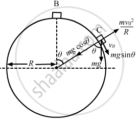 \[ \Rightarrow V^2 = 4 \nu_0^2 - 2g \left[ \text{ l } \sin g \theta + R \left( 1 - \cos \theta \right) \right]\]