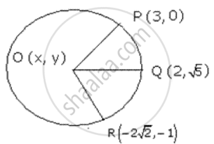 Find the coordinate of O , the centre of a circle passing through P (3 , 0), Q (2 , `sqrt 5`) and R (`-2 sqrt 2` , -1). Also find its radius.