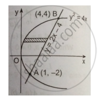 ∴` A= int_-2^4 int_(y^2)"^(y+4)/2 dxdy=int_-2^4 [x]_(y^2/4)^((y+4)/2) dy`