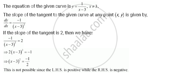 Find the equation of all lines having slope 2 which are tangents to the curve `y = 1/(x- 3), x != 3`
