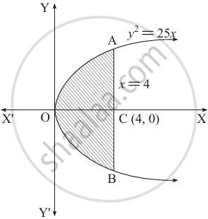 = `2 int_0^4 y dx`, where y2 = 25x, i.e. y = 5`sqrt x`
