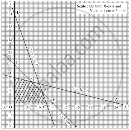 First we draw the lines AB, CD and EF whose equations are x + 4y = 24, 3x + y = 21 and x + y = 9 respectively.