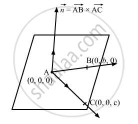 \[ \vec{n} = \vec{AB} \times \vec{AC} = \begin{vmatrix}\hat{i} & \hat{j} & \hat{k} \\ - a & b & 0 \\ - a & 0 & c\end{vmatrix} =\text{bc } \hat{i} + \text{ ac }\hat{j} + \text{ab } \hat{k} \]