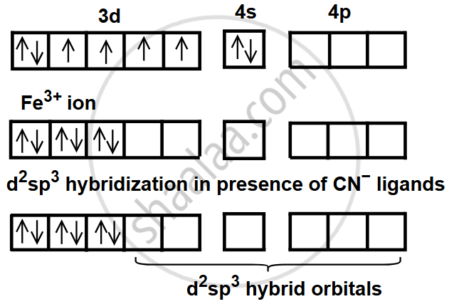 In [Fe(CN)6]3−, iron is in the +3 oxidation state, with the configuration [Ar] 3d5. The ligand CN− is a strong field ligand, which causes pairing of electrons in the 3d orbitals. This allows Fe3+ to use two 3d, one 4s, and three 4p orbitals for d2sp3 hybridisation.