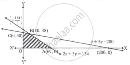 Feasible region lies on the origin side of 2x + 3y = 134 and x + 5y = 200, in first quadrant.