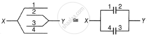 Four plates of equal area A are separated by equal distance d and are arranged as shown in Figure A. Their equivalent capacity is C1. Then, the same four plates are arranged as shown in Figure B, and their equivalent capacity is C2, then C1 : C2 is 2 : 3.